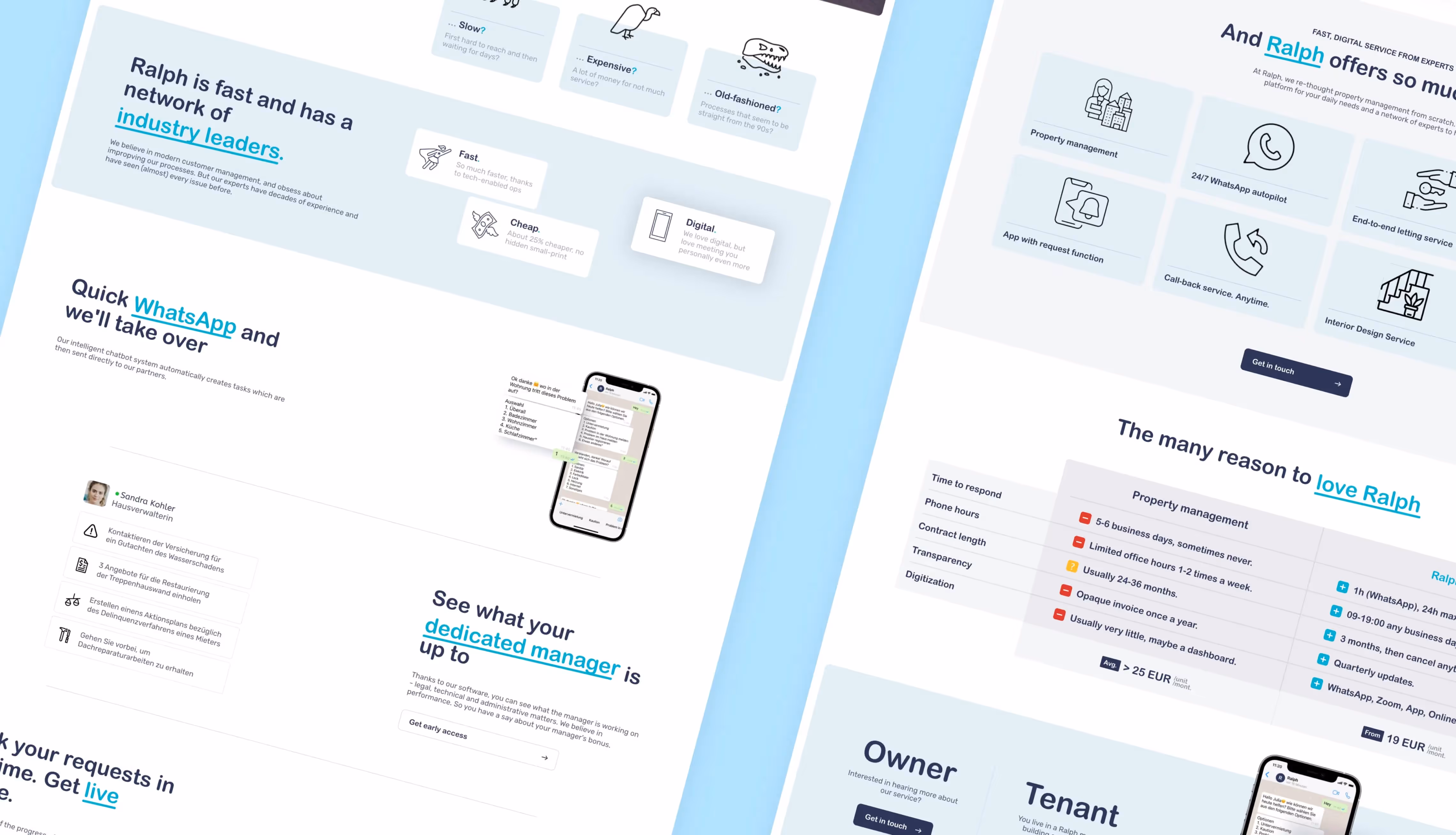 Ralph is a property management company in Germany aimed to deliver fast and individual service to their customers. The company didn`t have an opportunity to hire in-house experts to develop and maintain new website and dashboard for clients. Our goal was to match talents to the project and build a digital solution useful for every consumer and cost-effective for the company itself.